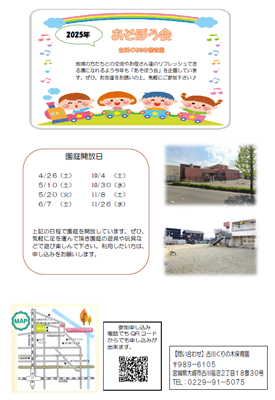 下記の日程で園庭を開放しています。ぜひ、気軽に足を運んで頂き園庭の遊具や玩具などで遊び楽しんで下さい。利用したい方は、申し込みをお願いします。