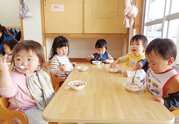 4月のお誕生会のおやつは、クッキー生地の土台にいちごババロアと、りんごジュースに桜の花びらを散りばめて冷やした2層のケーキでした。春らしいおやつに喜ぶ子どもたち。先生がケーキを切るたびに「わぁー‼」と歓声が上がっていました。 先生がケーキを切り始めると、集まってくるこどもたち。 先生がお皿にケーキを置くと、揺れるケーキを見て大興奮の子どもたち。一皿ごとに反応して、とても楽しそうです。 小さいお友だちも、味わって、きれいに食べてくれます。