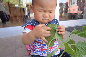 日かげが心地よく感じる日に、野菜の苗植えが行われました。初めて触れる苗に興味津々で、じっと見つめたり、葉を覆ううぶ毛でふわふわする茄子の葉を確かめるように触っていました。野菜の成長を楽しみながら、おいしく食べられる日を心待ちにしたいと思います。