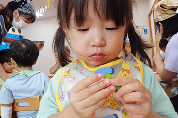 春に種をまいた枝豆が莢をつけ、ようやく、ふっくらと膨らみました。今年は雨が少なかったのでなかなか膨らまず、本当に待ち遠しかったです。枝から莢を外すのは、意外に力が必要でしたが、一生懸命引っぱってくれました。取り外した莢を嬉しそうに触ったり、葉っぱを見せあいっこしていましたよ。そして午後おやつでは、先生に莢から豆を出す方法をレクチャーしてもらって、おいしくいただきました。莢から豆が出てくるのを不思議そうに覗いたり、ぴょんと飛び出す豆を面白そうに見ていて、楽しそうでしたよ。