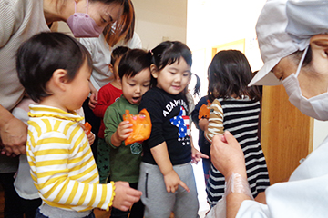 午前おやつを食べている1・2歳児の子どもたちが「トリックアトリート」「お菓子ちょうだい」と給食室におやつを取りに来てくれました。かぼちゃの模様の袋を見て、わくわくするお友だち、何が入っているのか分からず、調理員さんに渡し返すお友だち、様々な反応があり、とても微笑ましかったです。